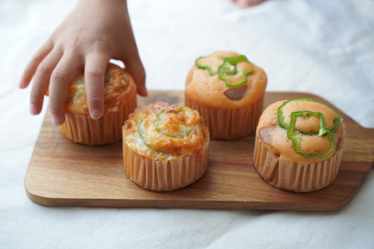 コーンを入れて、マフィン型で焼いてチーズやピーマン、ソーセージを入れてピザパン風にしたり